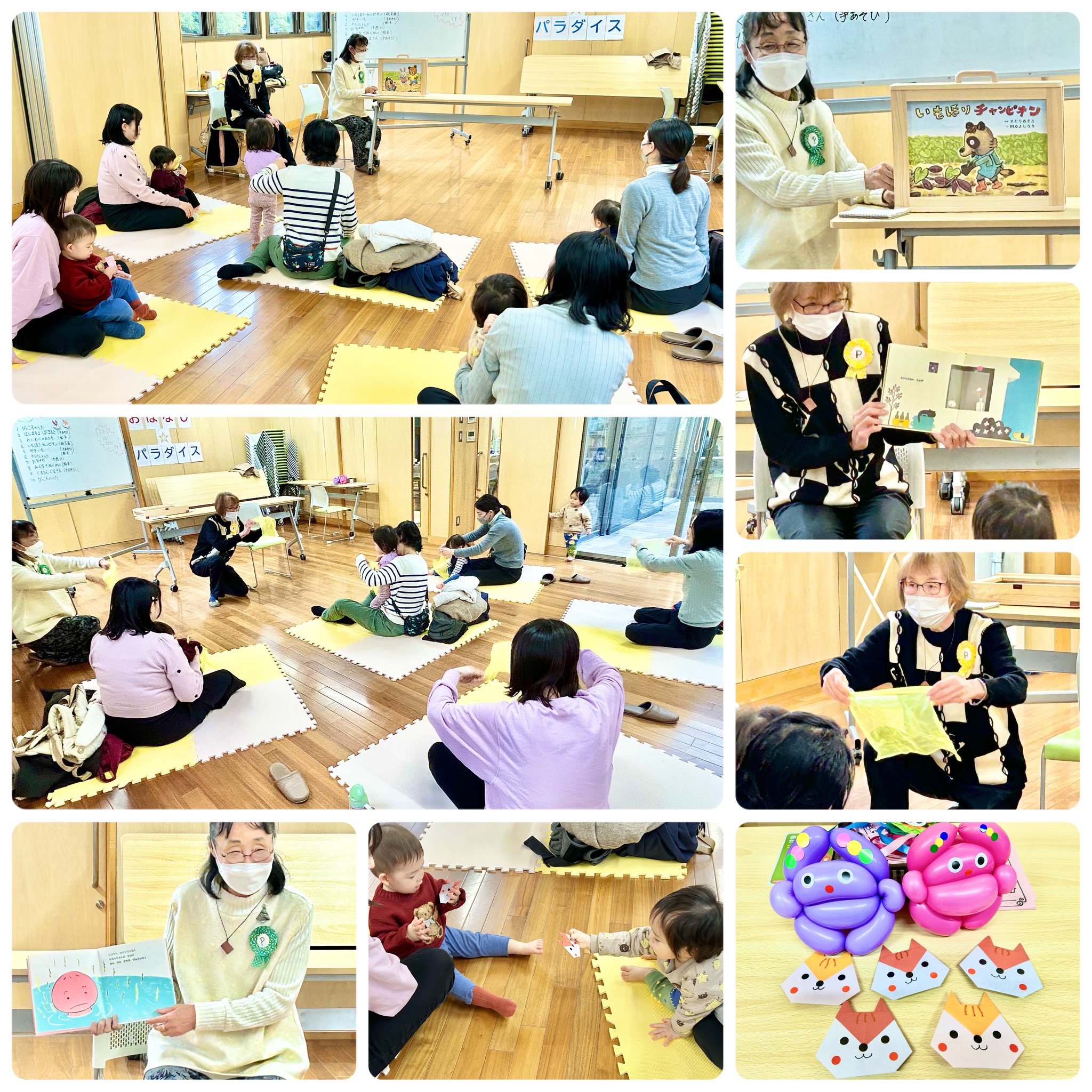 おはなしやぴっころさんの楽しいおはなし会!今月は、秋らしい、絵本や紙芝居のほかに柔らかい布を使った手遊びも!折紙でつくったリスをもらって、皆、嬉しそう☺