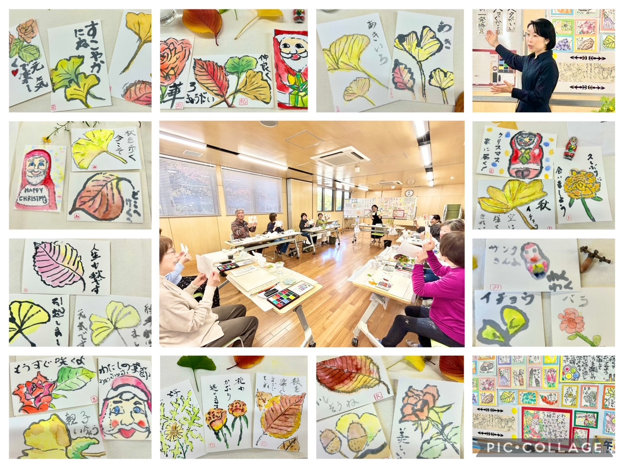 今回は、いちょうや紅葉した葉やどんぐり、バラの花、チョコレートのサンタさん、を自由に描いていただきました。愛子先生の分かり易いご指導と、たくさんのお声がけで、皆さん、集中して素晴らしい作品を完成させ、最後は全員で観賞会となりました。