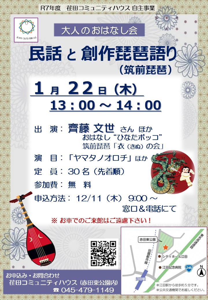🎄大人のおはなし会 ~民話と創作琵琶語り(筑前琵琶)~ ・・・1/22(木)開催