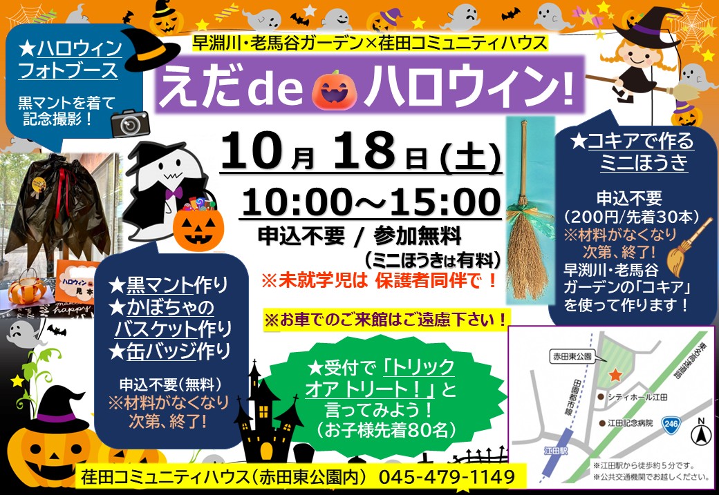 今年の「えだ de ハロウィン」は、早渕川・老馬谷ガーデン で育てている「コキア(和名はホウキギで、紅葉する植物)」を使って、「ミニほうき」を作るワークショップを行います!(200円 先着30本)