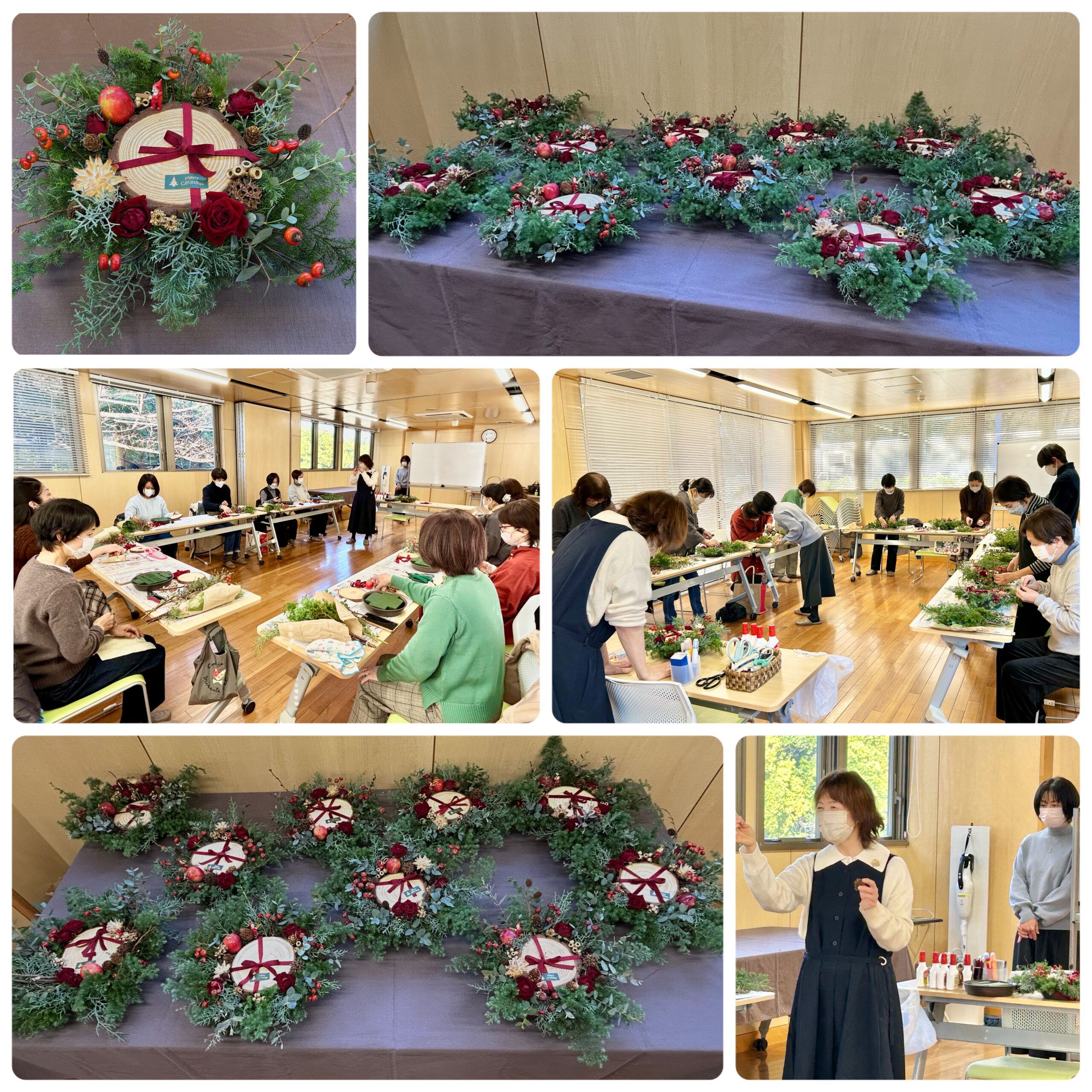 いつも大人気のクリスマスフラワーアレンジメント講座。今年は、バームクーヘンの様な切り株と、ベルベットリボンがお洒落なデザインで、皆様、素敵な作品が完成!講師&助手の先生方、沢山の準備とご指導をありがとうございました☺