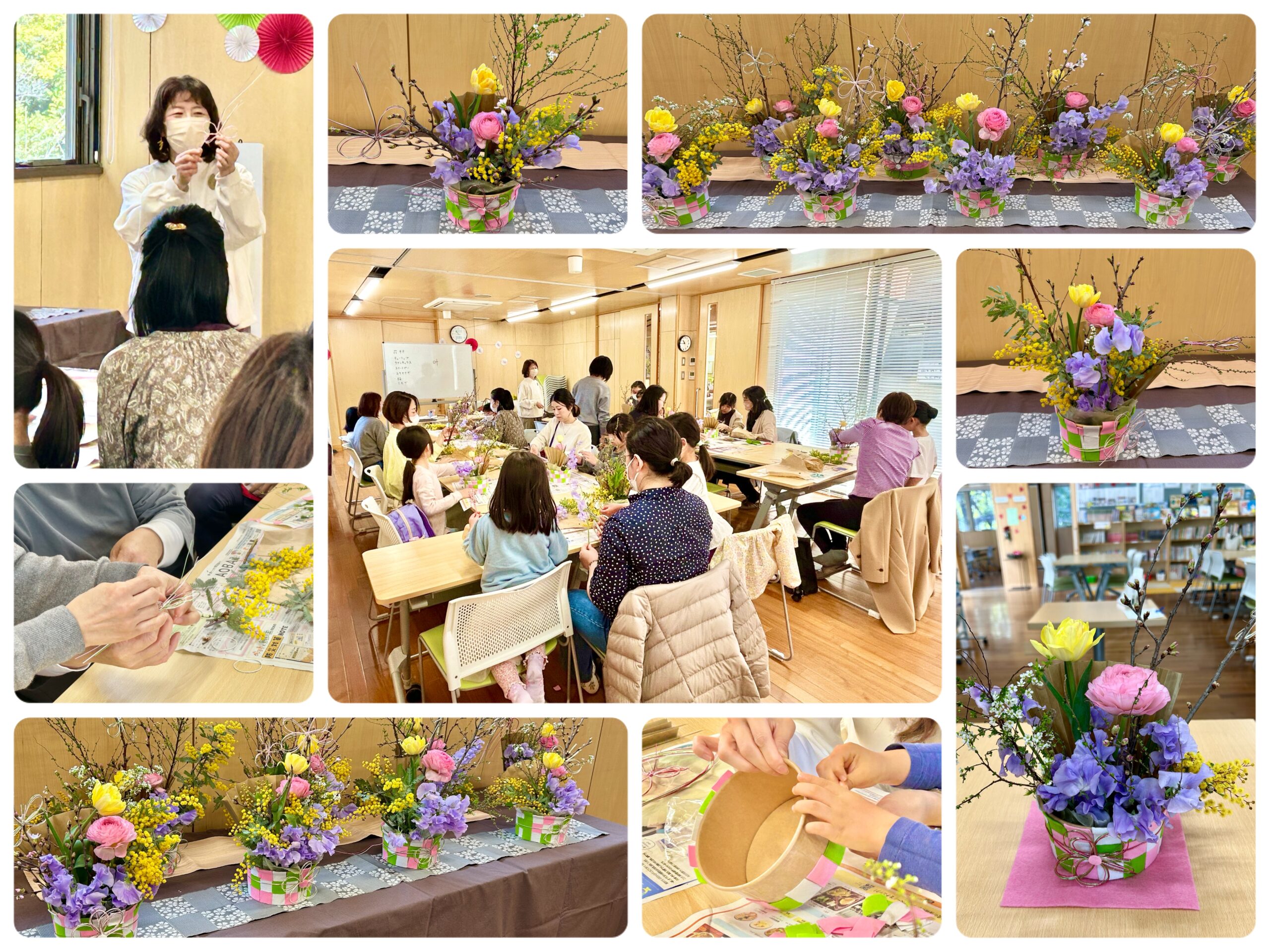 暖かい春のような日に、親子で春らしい可愛いアレンジメントを生花で作りました。最初は器作りで、ひし餅色(ピンク、白、黄緑)の3色のフェルトを思い思いに貼り、それから花材(チューリップ、ラナンキュラス、スイトピー、ミモザ、桜、雪柳)を刺していきました。最後は水引きの飾りを作って完成~♪ 大満足の作品が出来上がりました。お家で飾って、素敵なひな祭りにして下さいね💛