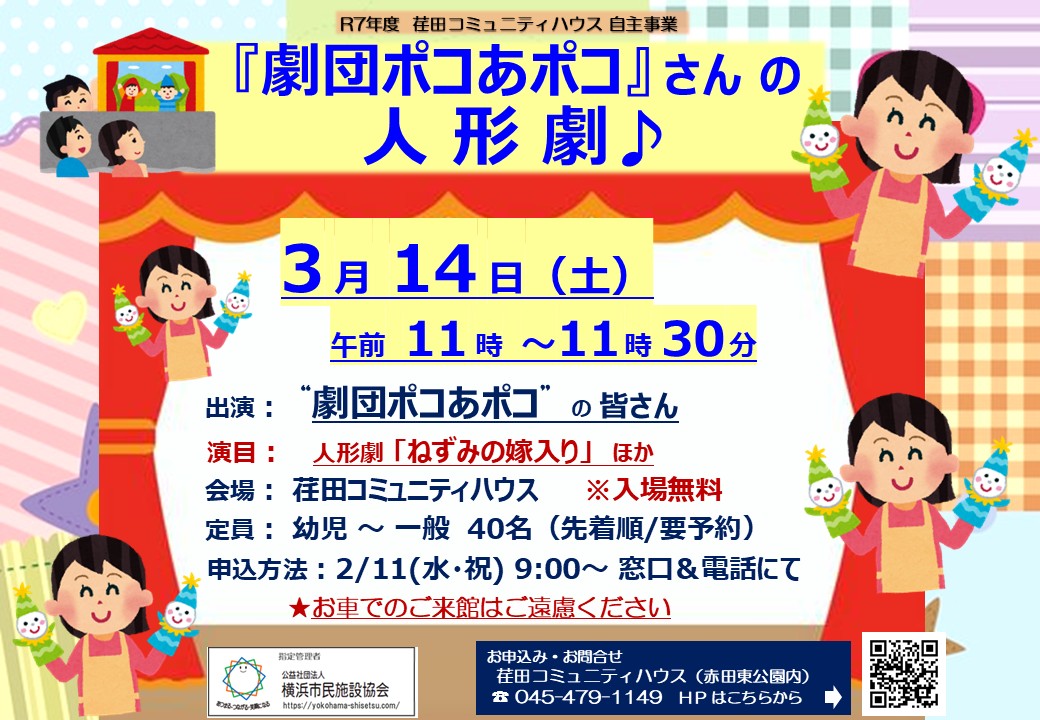 💛『劇団ポコあポコ』さんの人形劇・・・ 3/14(土)開催
