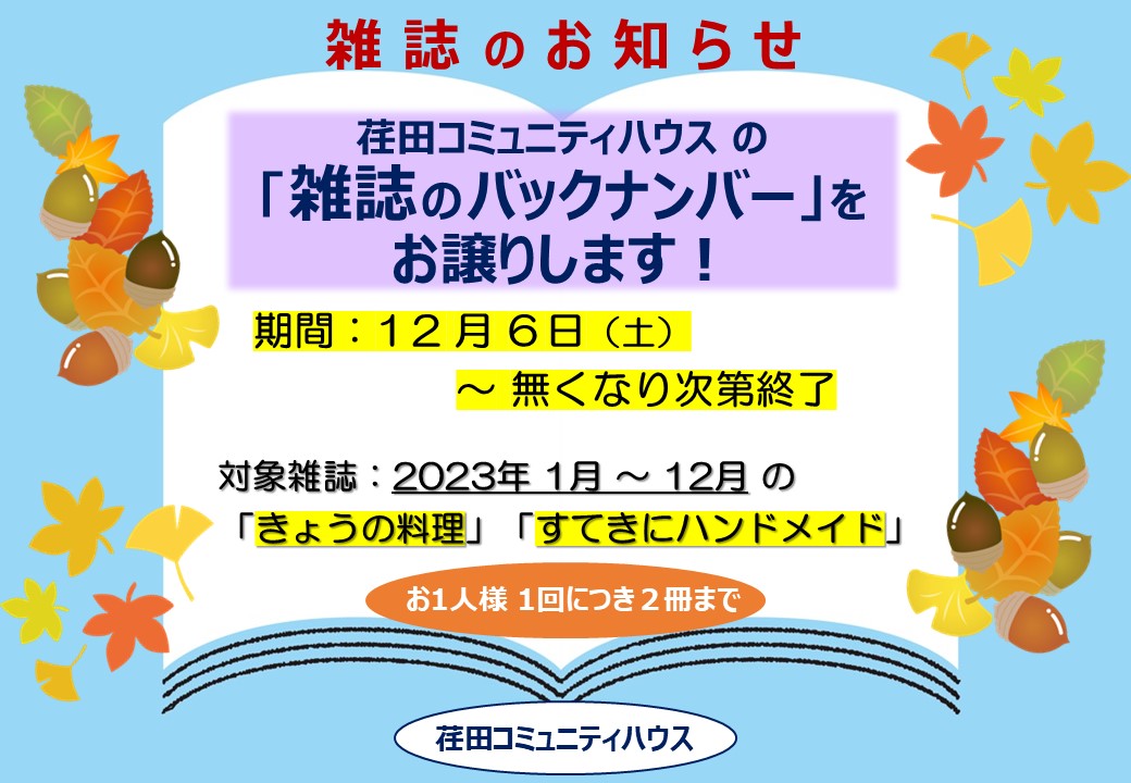 荏田コミュニティハウスで貸出をしていた 2023年1月~12月の 月刊誌「きょうの料理」「すてきにハンドメイド」を、12/6(土)より 希望される方にお譲りいたします。