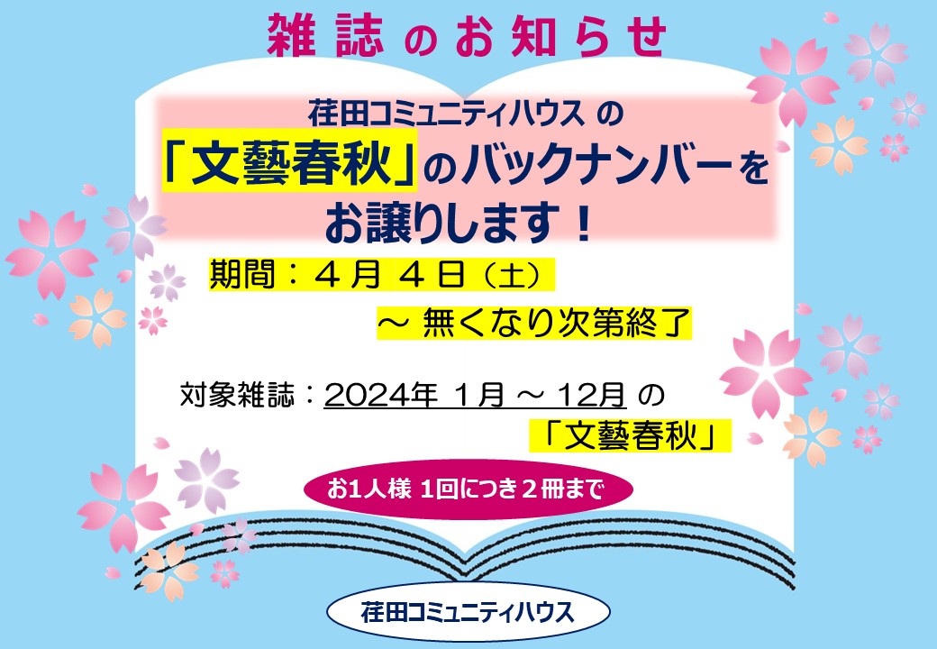 2026年03月11日 「文藝春秋」のバックナンバーをお譲りします! 荏田コミュニティハウスで貸出をしていた 2024年1月~12月の 月刊誌「文藝春秋」を、4/4(土)より 希望される方にお譲りいたします。 尚、お1人様1回につき2冊まで となります。