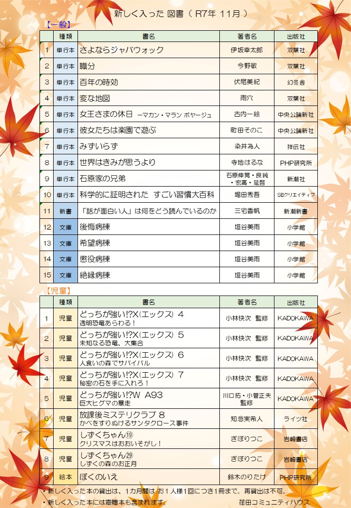 2025年11月23日 新しい本のご案内【R7.11】 11月に新しく入った図書(一般書・児童書)です。 (新しい図書は、用意ができ次第、随時 配架しております。) ※蔵書一覧は「図書案内」からご覧になれます。