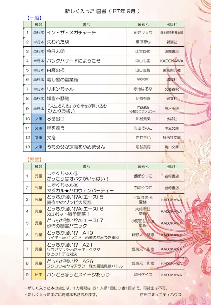2025年09月24日 新しい本のご案内【R7.9】 9月に新しく入った図書(一般書・児童書)です。 (新しい図書は、用意ができ次第、随時 配架しております。) ※蔵書一覧は「図書案内」からご覧になれます。