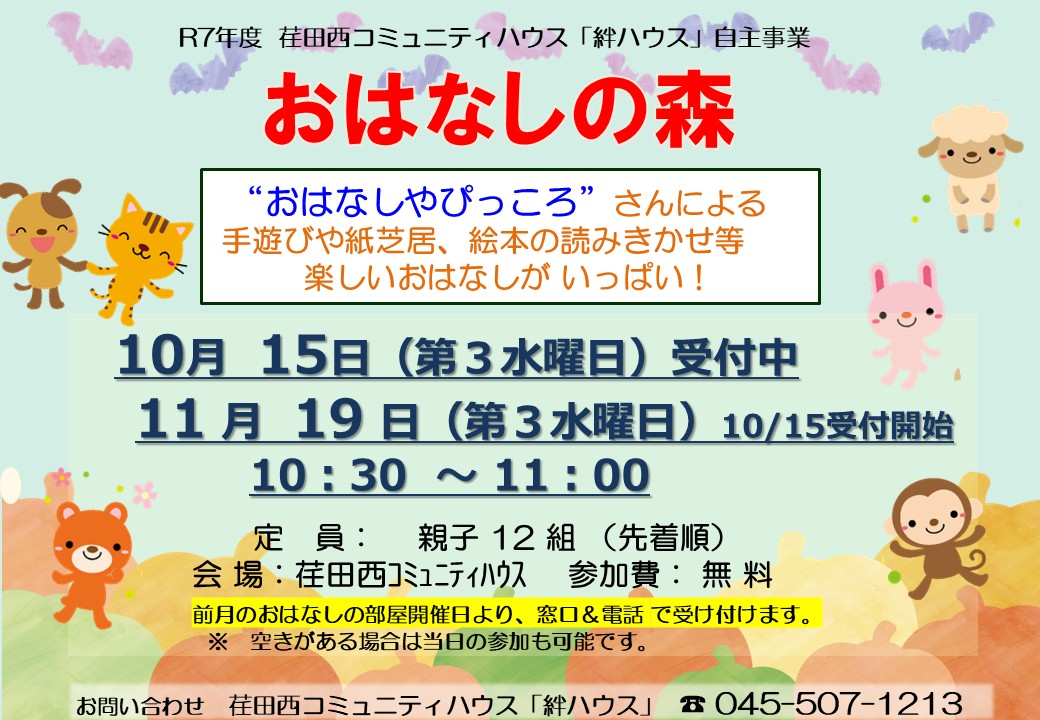 ◆おはなしの森 毎月第3水曜日に開催しています。開催日に翌月の申し込みも受付開始しています。