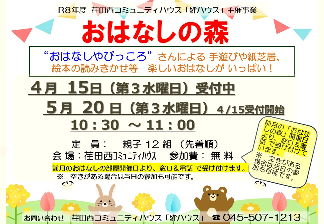 ◆おはなしの森 毎月第3水曜日に開催しています。開催日に翌月の申し込みも受け付けています。