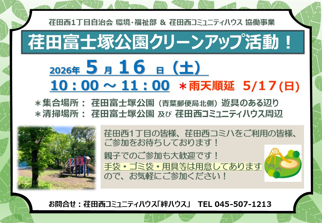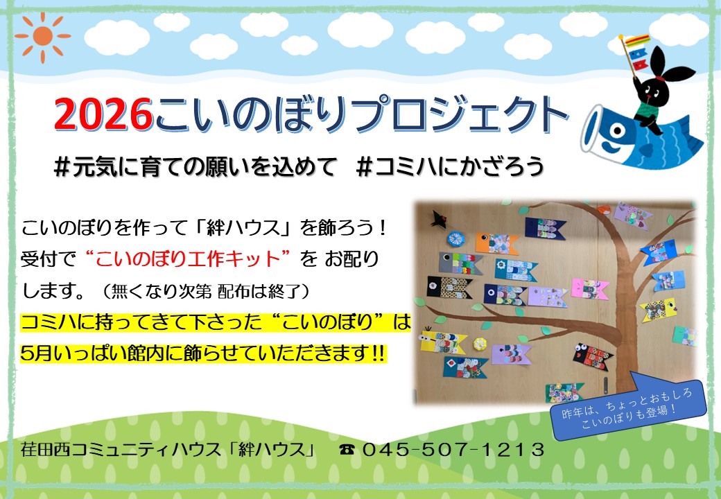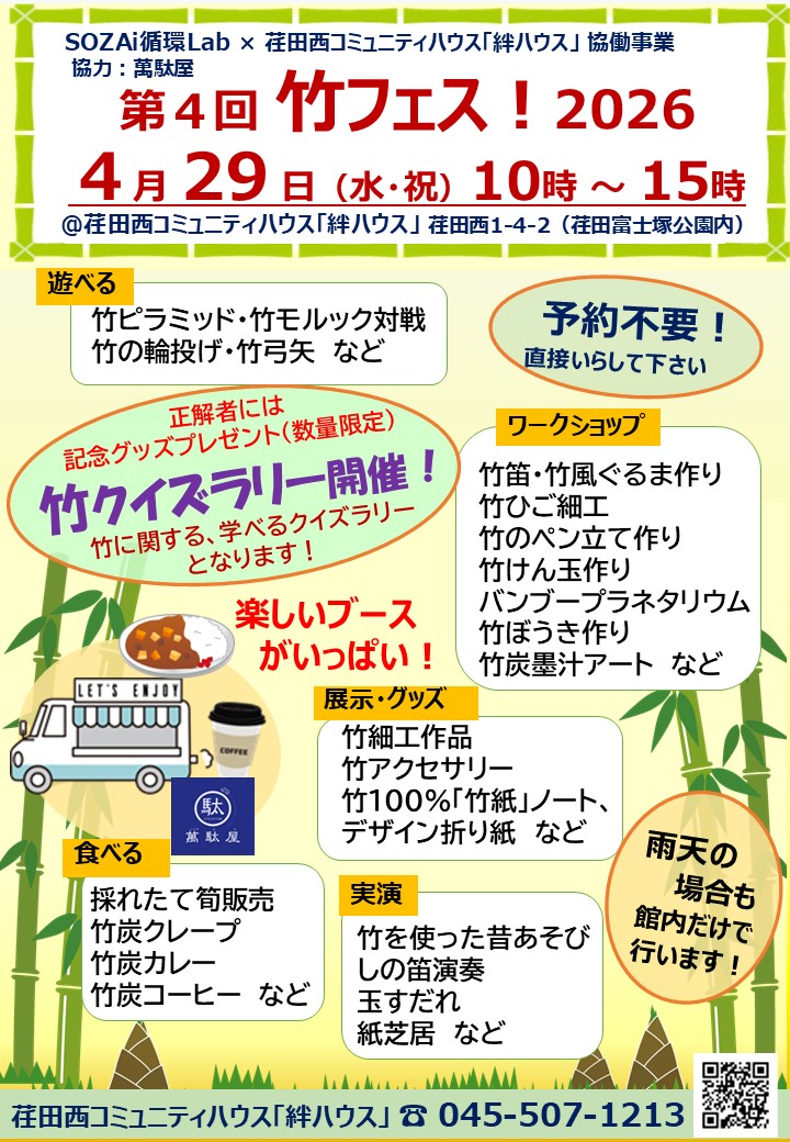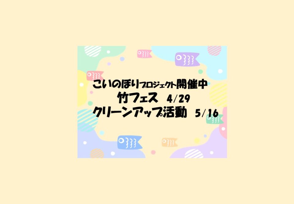 2026年04月01日 4~5月 当日参加イベント(竹フェスも更新) ◆こいのぼりプロジェクト・・・4/6~ 受付までお越しください ◆竹フェス・・・4/29(水・祝)今年も楽しく!お楽しみに! ◆荏田富士塚公園クリーンアップ活動・・・5/16(土) 雨天順延