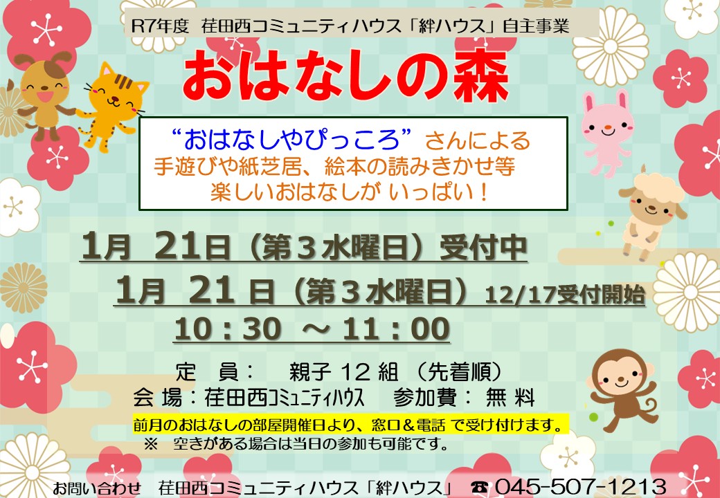 ◆おはなしの森 毎月第3水曜日に開催しています。開催日に翌月の申し込みも受け付けています。