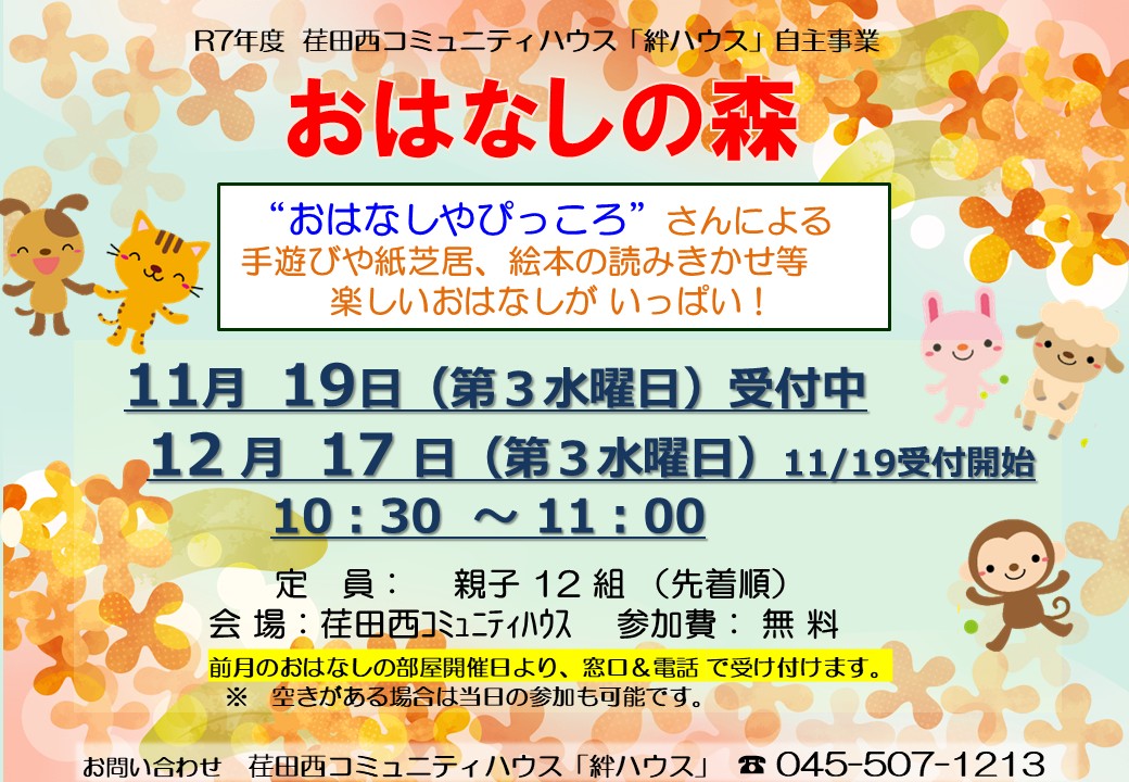 ◆おはなしの森 毎月第3水曜日に開催しています。開催日に翌月の申し込みも受付開始しています。