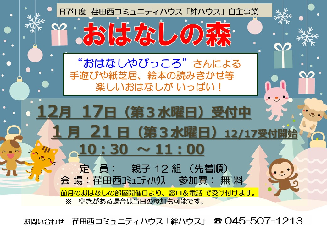 ◆おはなしの森 毎月第3水曜日に開催しています。開催日に翌月の申し込みも受付開始しています。