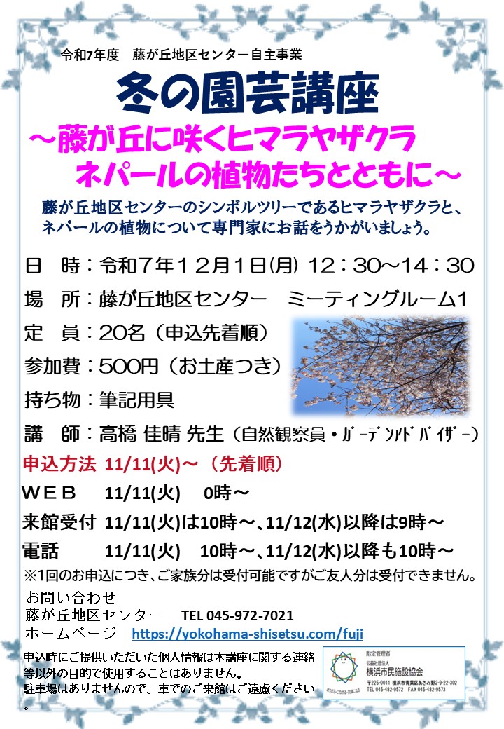 11月11日(火)より募集開始の講座のご案内です。電話・窓口・WEB(こちらのページ)よりお申し込みください。全講座共に先着順です。詳細はチラシ(PDF)にてご確認ください。