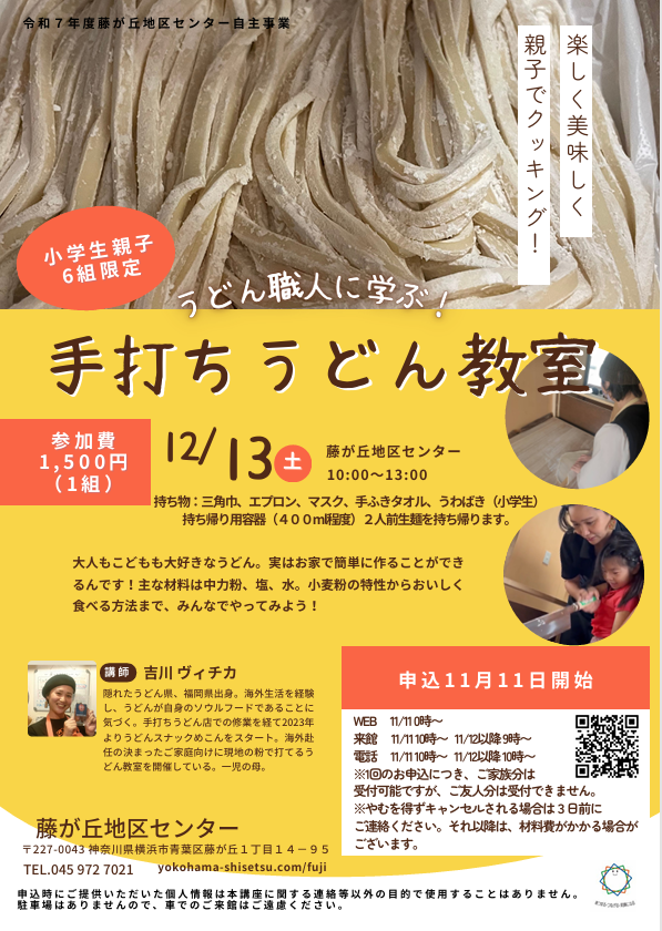 講師の先生は、最近人気のうどん県、福岡出身。まじりっけなしの小麦の味が堪能できる手打ちうどんを、家族で一緒に作ってみよう!出来たてのシンプルなうどんの試食と、2人前の生麺を持ち帰りもあります。