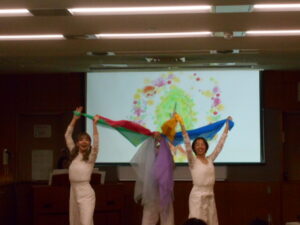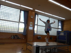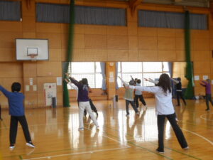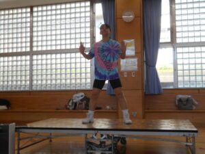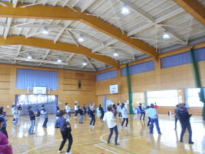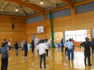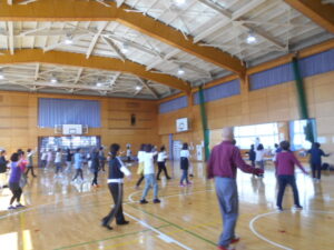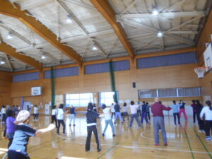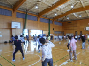 同じグループの人同士、ハイタッチをしたり、二人一組でステップを踏んだり、楽しくワイワイ運動できました。