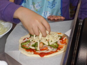今回、親子で楽しむピザづくりを行いました。ボールの中で生地をこねるところから挑戦!手でこねる生地の手触りを楽しみながら、楽しく作ることができました。