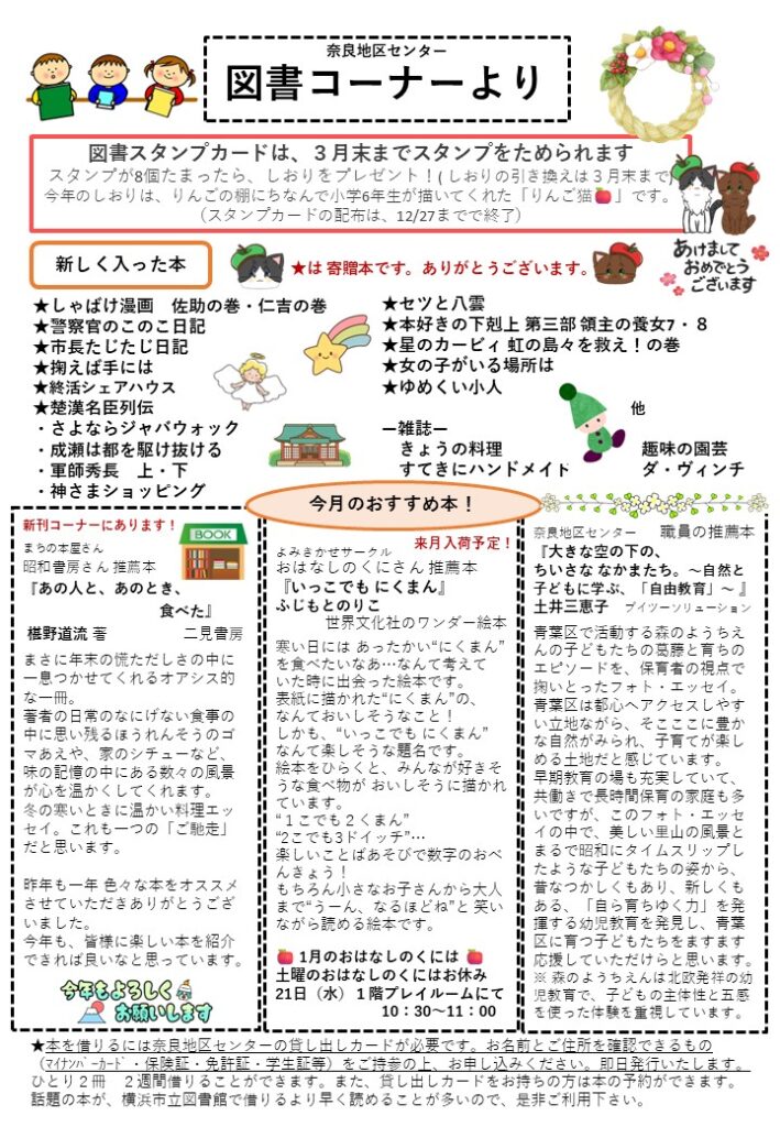 市立図書館が蔵書より外した本を、『横浜市立図書館再活用図書』として奈良地区センターに譲っていただきました。再活用シールの貼った本がその本になります。新品ではありませんが、是非 手に取って借りて読んでみて下さい。(館内の蔵書の差し替えで棚に入っているものもあります。)12月・1月に新しく入った本のリストにも加えています。特設コーナーに置いてあります。