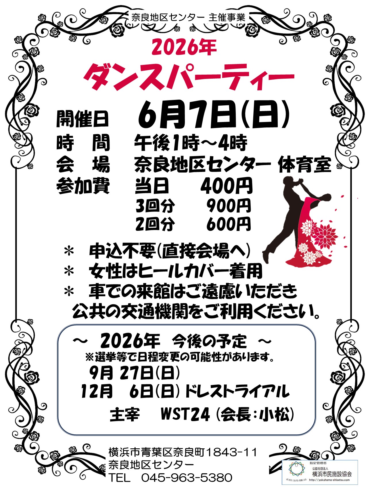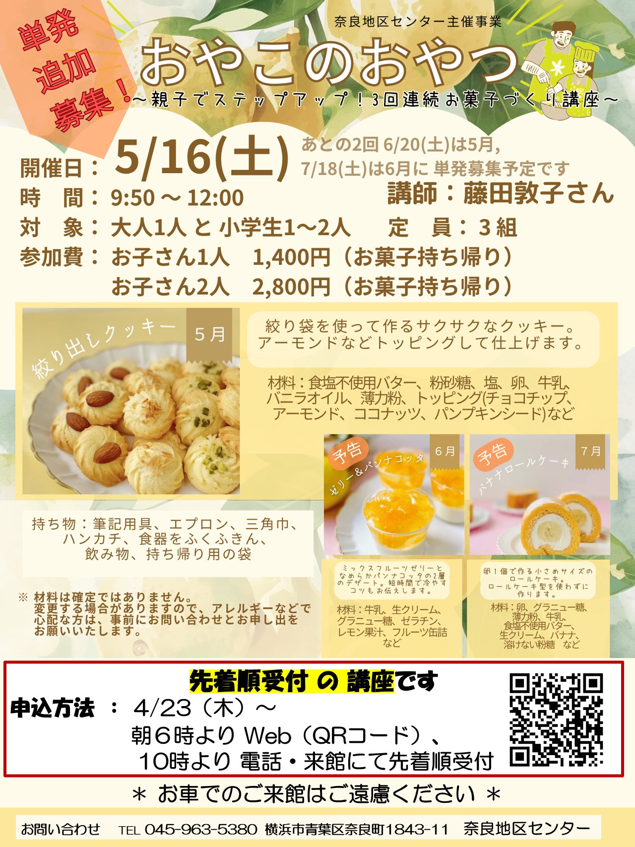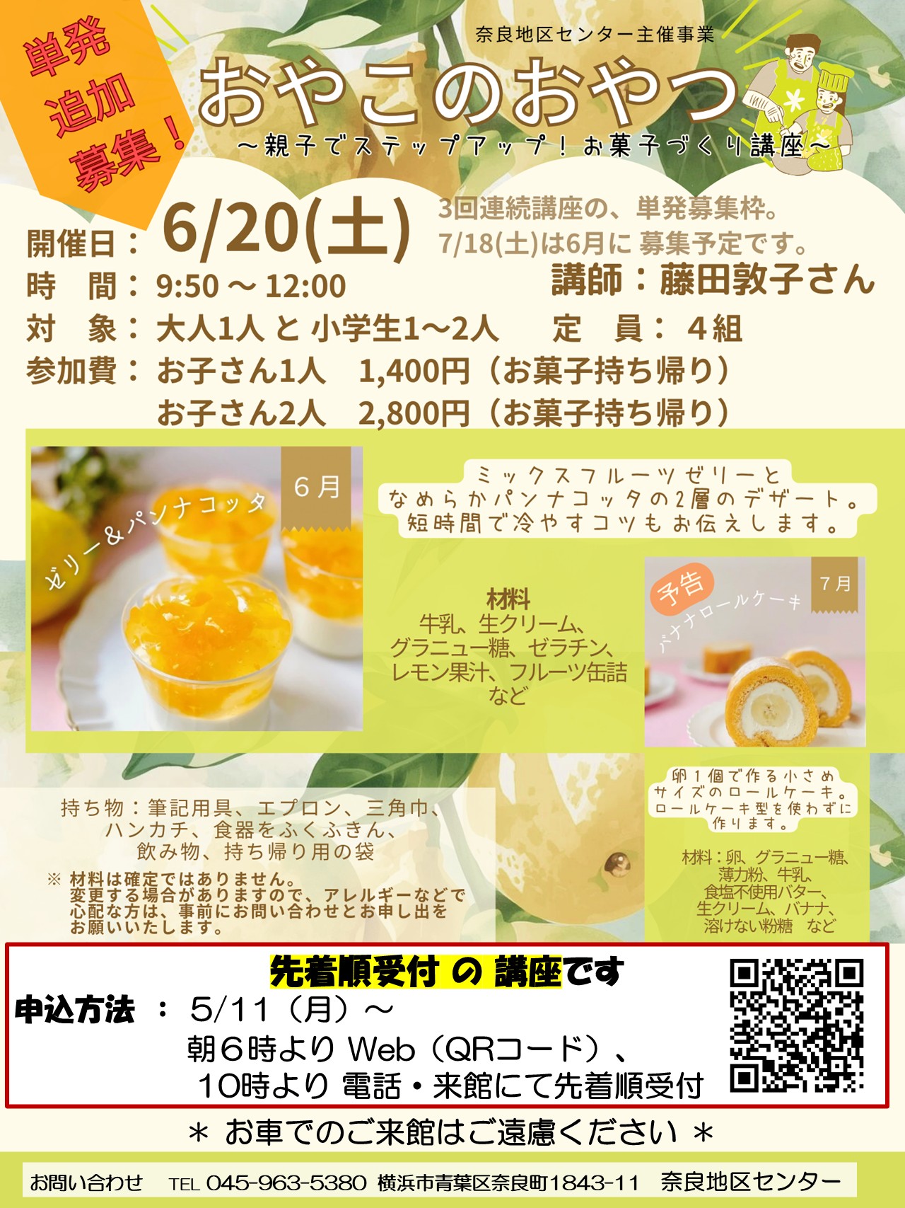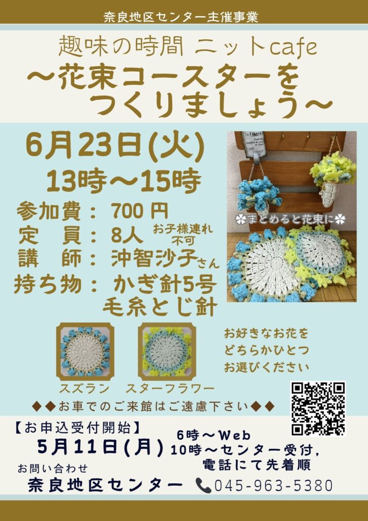 (WEBで満席となった場合でも、受付にて別枠、キャンセル待ちもございますのでお気軽に 奈良地区センター TEL045-963-5380までご連絡ください)
