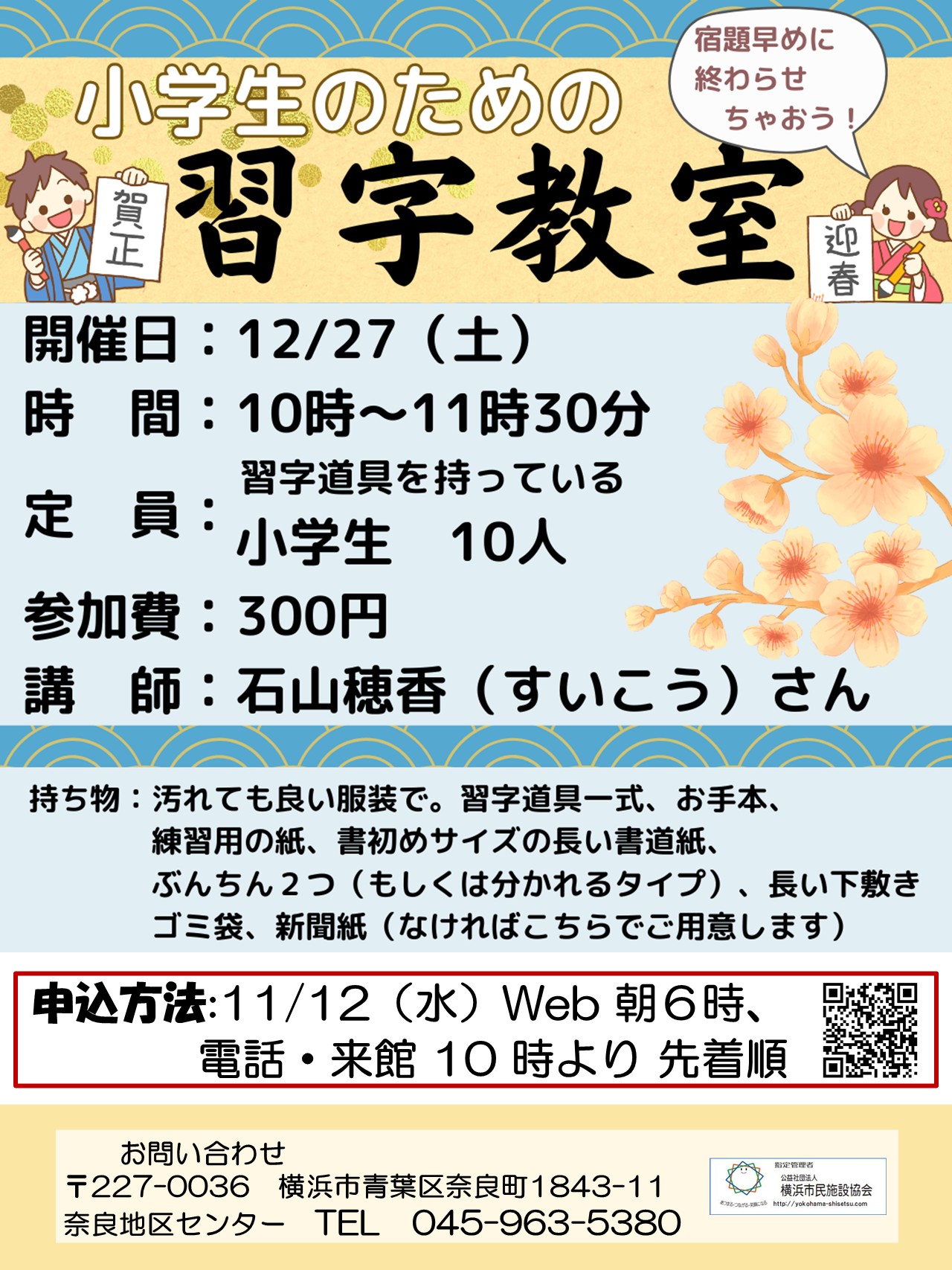◆11/12から先着順受付◆ 小学生のための習字教室 12/27(土) 10:00~11:30