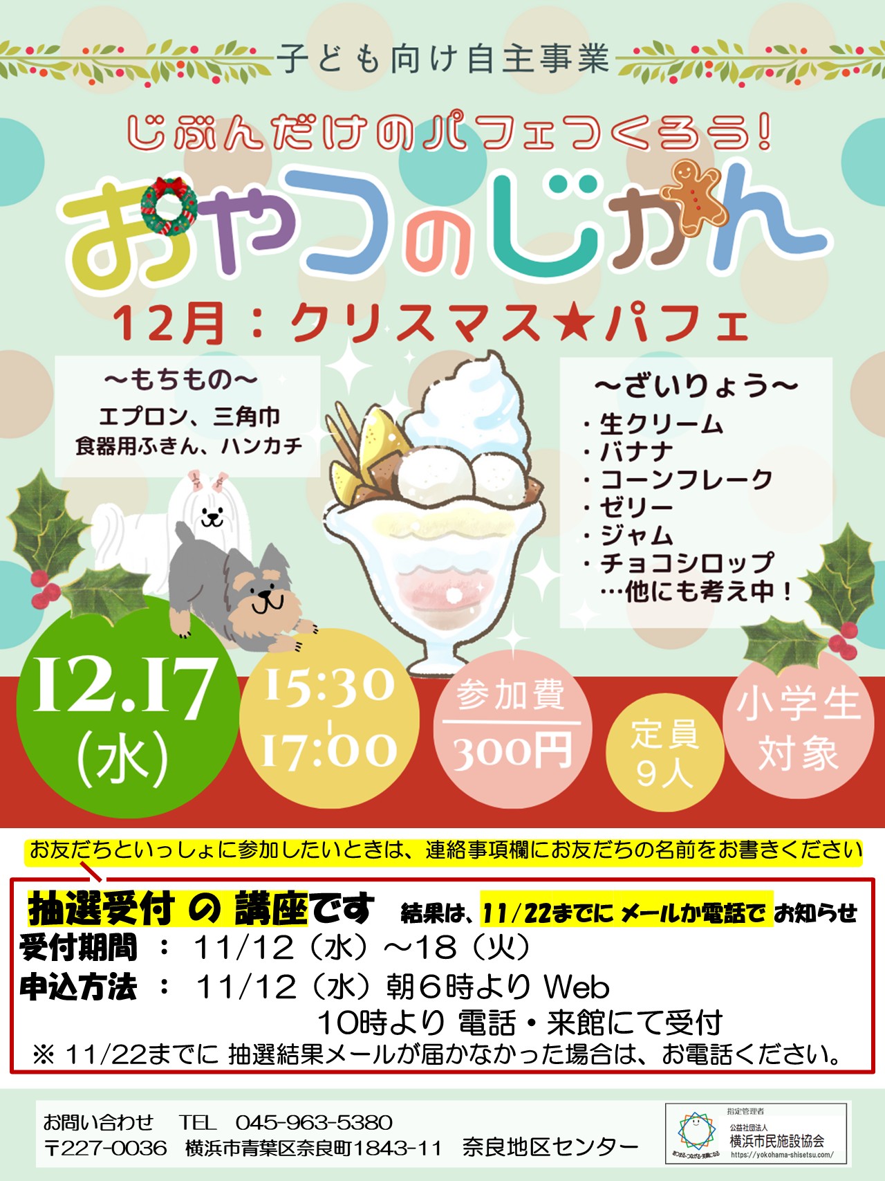 ◆11/12~18まで抽選受付◆ おやつのじかん ~ クリスマス★パフェ ~ 12/17(水) 15:30~17:00