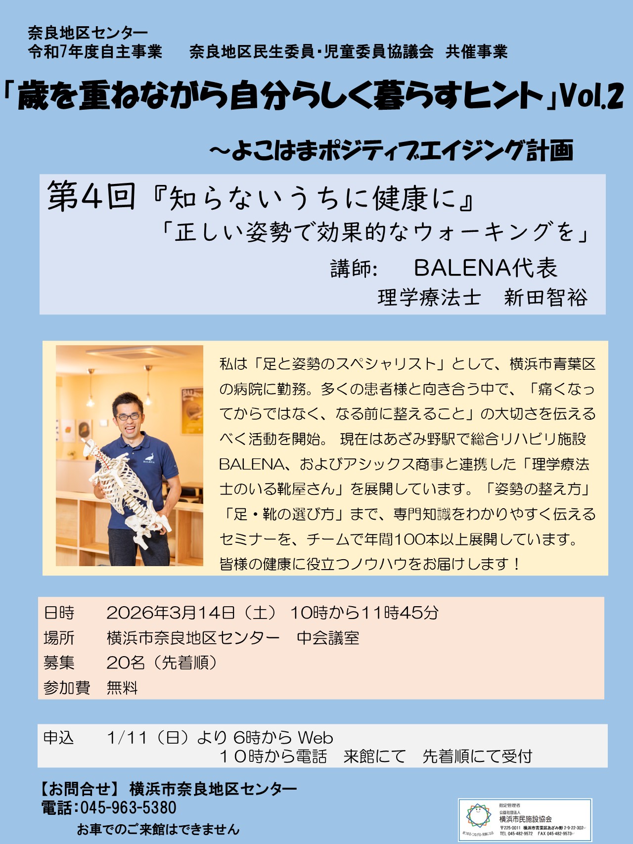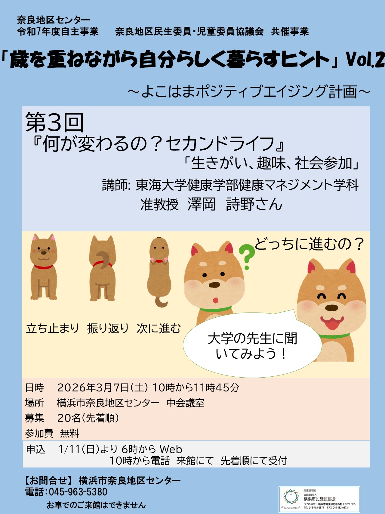 (WEBで満席となった場合でも、受付にて別枠、キャンセル待ちもございますのでお気軽に 奈良地区センター TEL045-963-5380までご連絡ください)