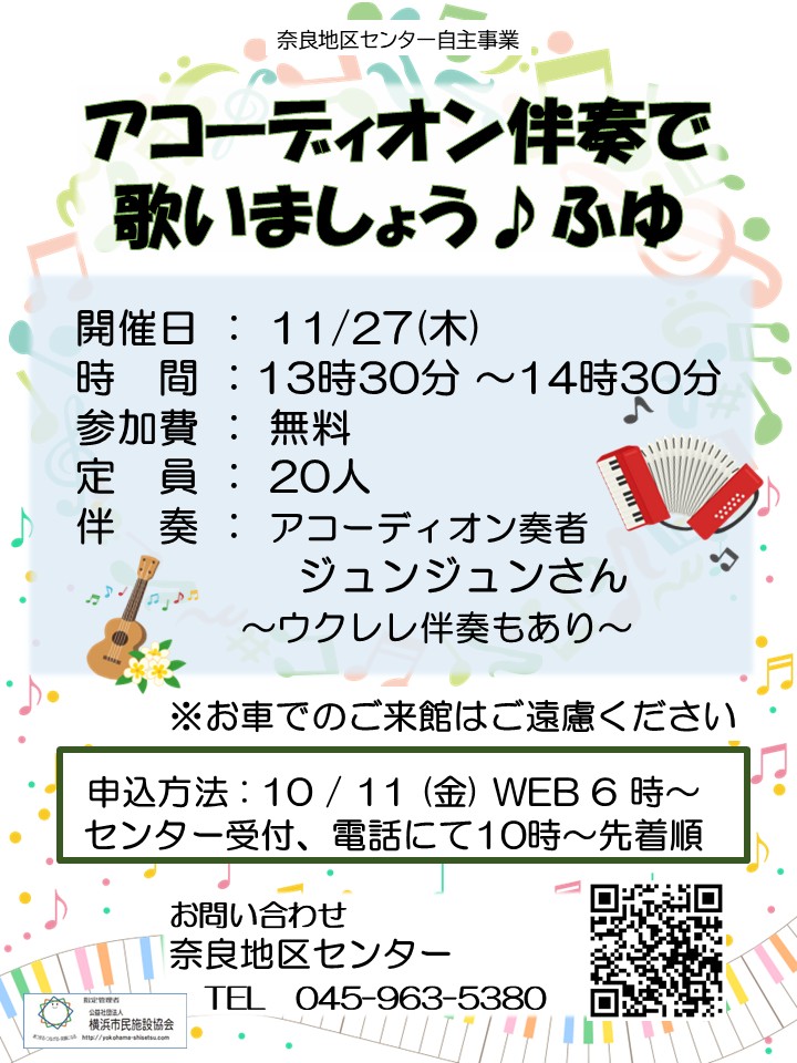 大人向け ◆10/11から先着順受付◆ アコーディオンの伴奏でうたいましょう♪ 11/27(木) 13:30 ~14:30