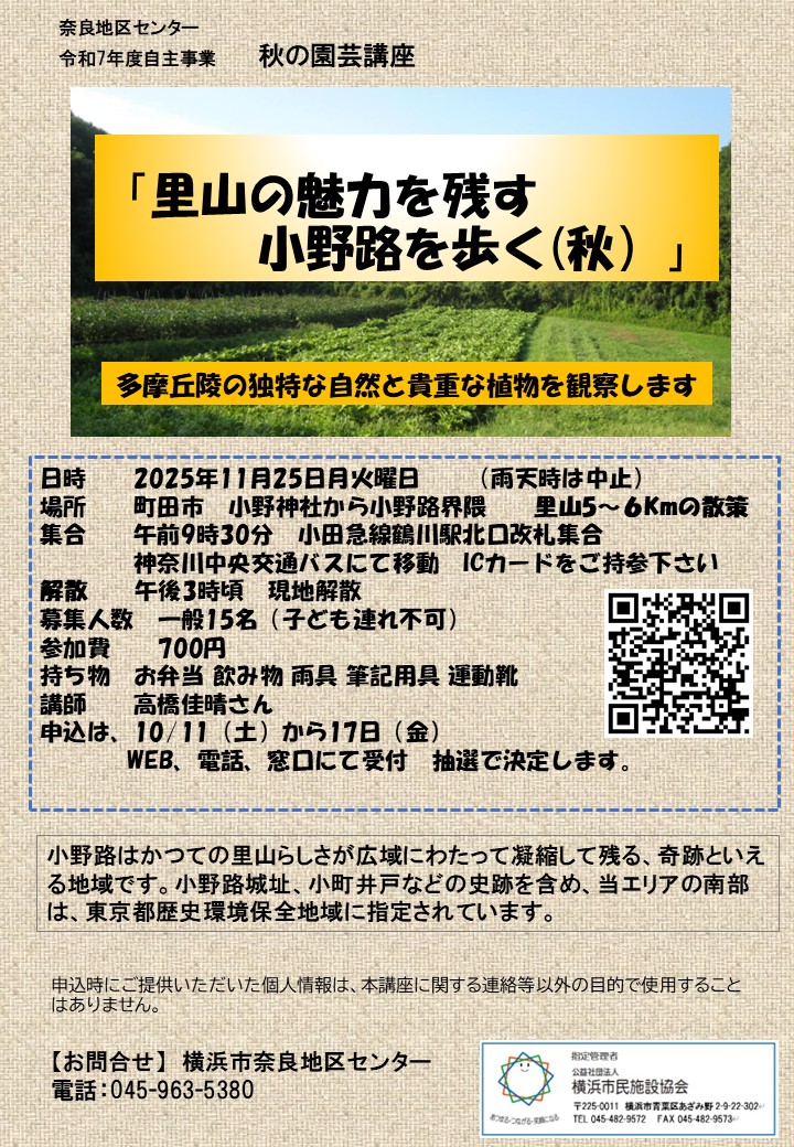大人向け ◆10/11~17抽選受付◆ 里山の魅力残す小野路を歩く 11/25(火) 9:30鶴川駅集合