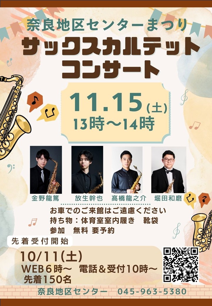 どなたでも ◆10/11から先着順受付◆ まつり★サクソフォンアンサンブルコンサート! 11/15(土) 13:00~14:00