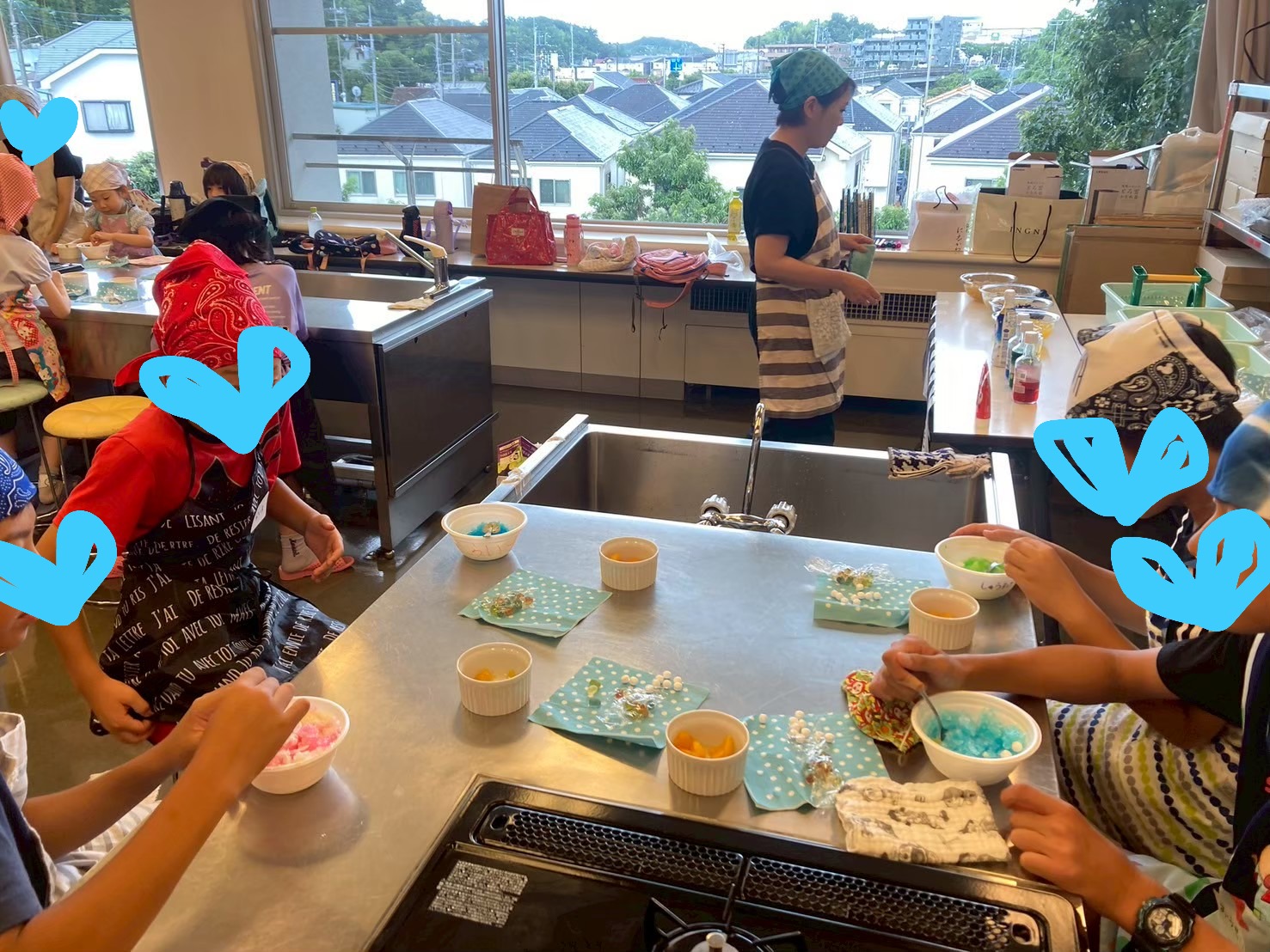 13人の子どもたちが協力しながらかき氷器を使って、いろんな色のシロップやトッピングを楽しみました。