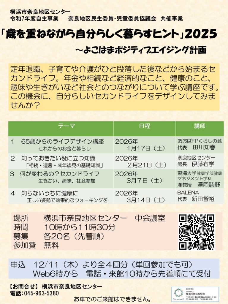 奈良地区民生委員・児童委員協議会 共催事業◆12/11から全4回分申込み開始(単回参加でも可)「歳を重ねながら自分らしく暮らすヒント」2025