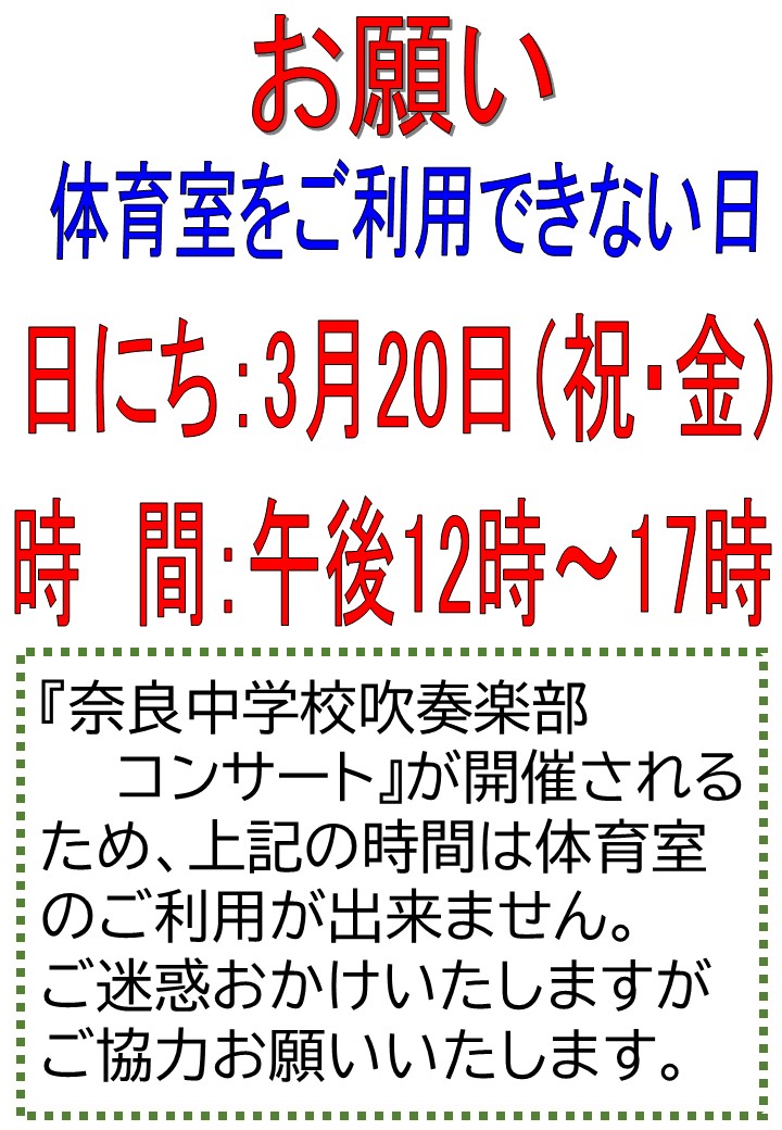 3月20日(祝金)は体育室個人利用がご利用できません。