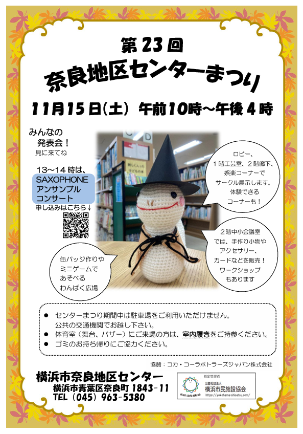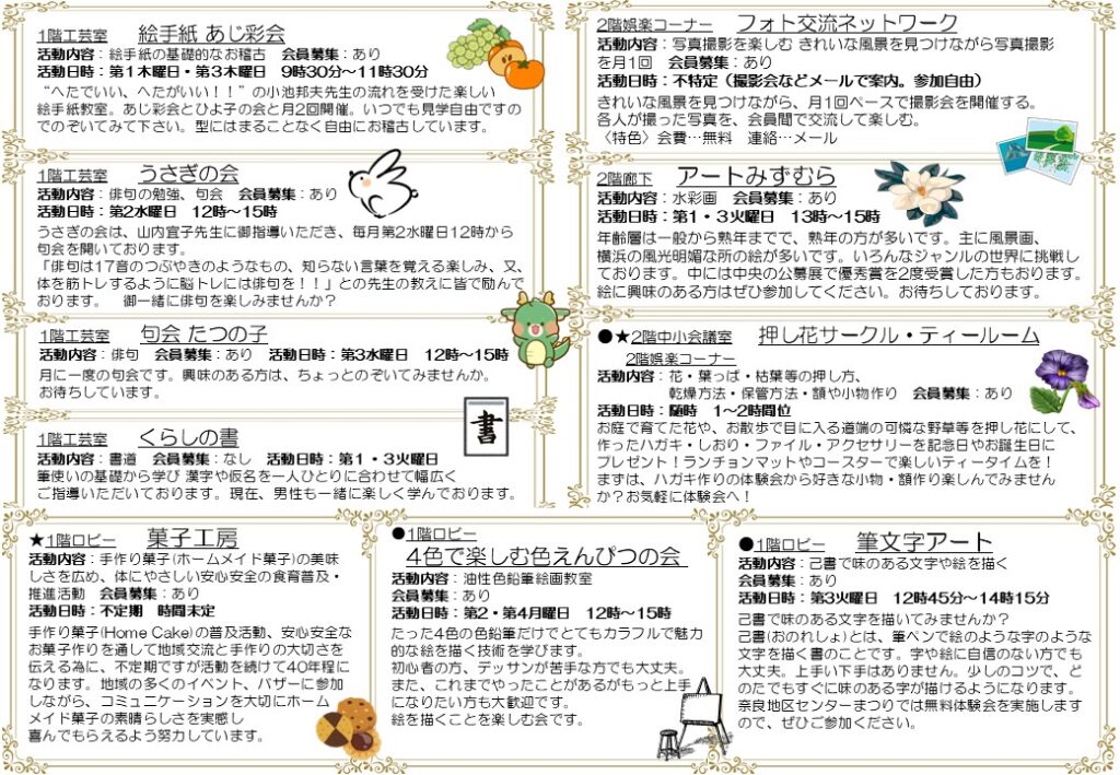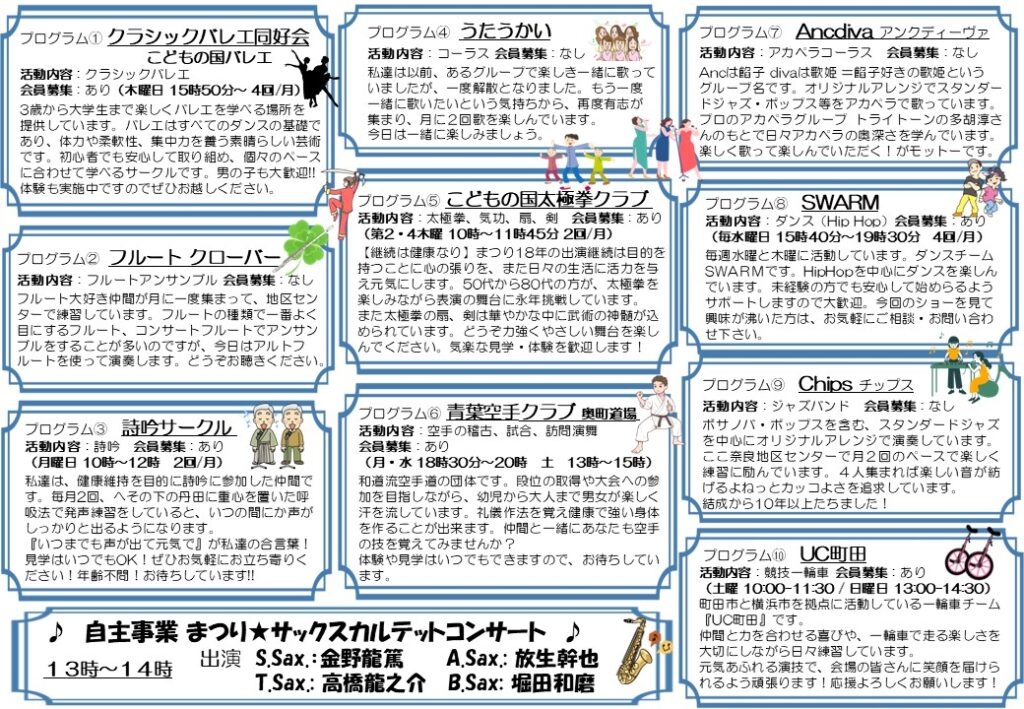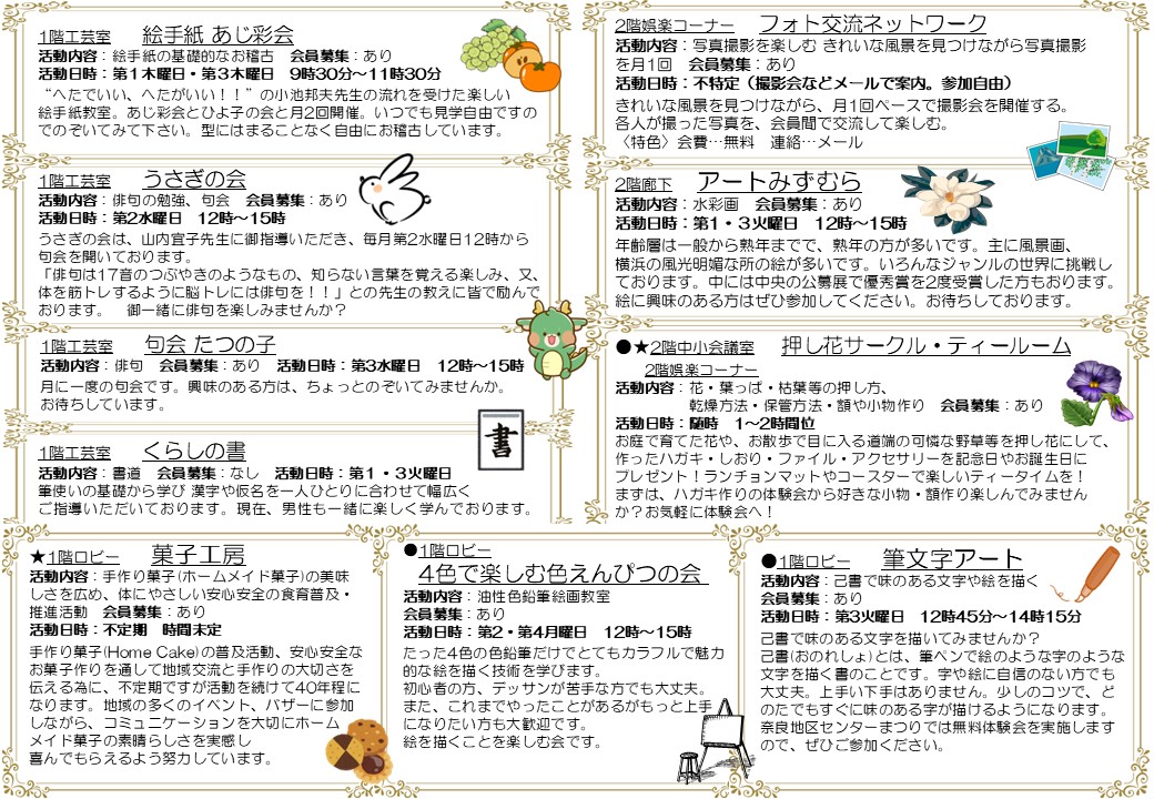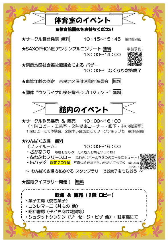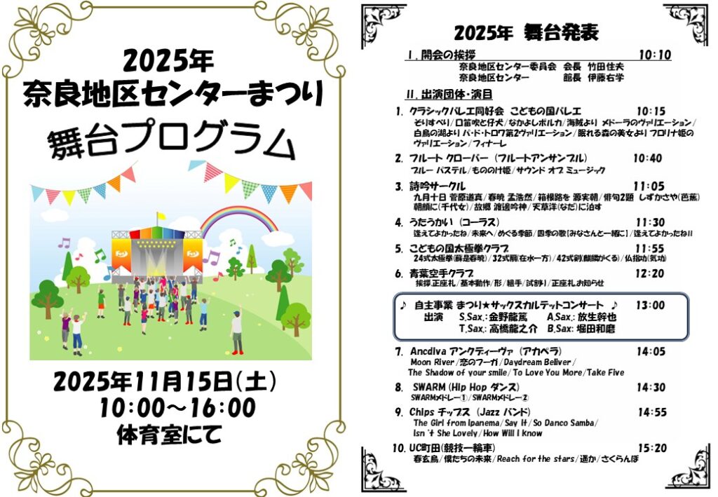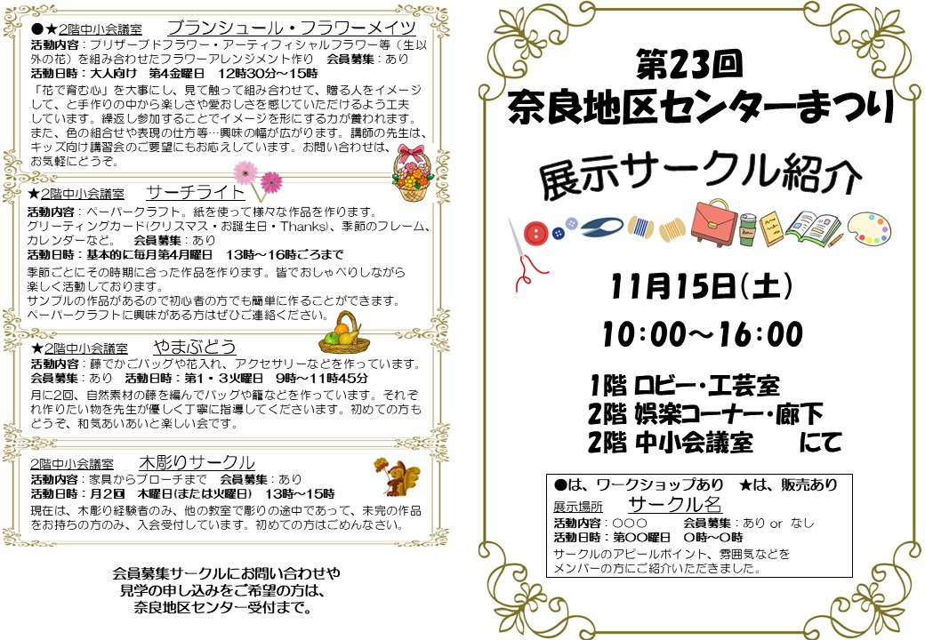 2025年10月29日 奈良地区センターまつりリーフレットができました ★第23回 奈良地区センターまつりはもうすぐ! リーフレットができましたので、ご覧ください。 館内にて配布しております。ご来館の際にお持ちください。 ★展示サークルの紹介 ★舞台出演サークルの紹介