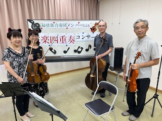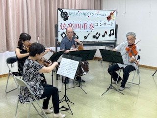 緑弦楽合奏団メンバーによる「弦楽四重奏コンサート」を開催しました。受付開始直後から多くの方々よりお申込をいただき当日も満席の盛況となりました。クラシックの名曲からミュージカル、民謡等バラエティーに富んだ選曲で、素晴らしい演奏を楽しみました。各曲のエピソードに加えて、楽器の説明もしていただき、「次回も必ず参加したい」「この曲も演奏して欲しい」といった熱いリクエストが多数寄せられました。メンバーの皆様、大変ありがとうございました!