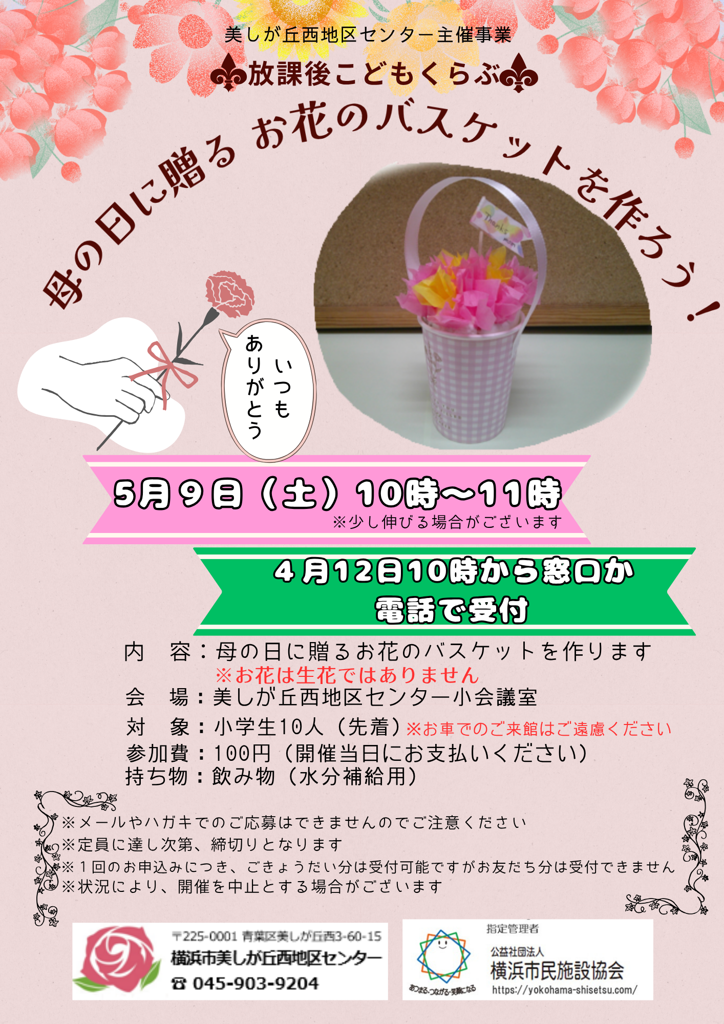 2026年04月02日 【募集】お子さま向け講座5月開催分~参加募集のお知らせ ◆放課後こどもくらぶ「母の日に贈るお花のバスケットを作ろう! 5月9日(土) 10時~11時 開催 今年の母の日は5月10日(日)です。 いつもは優しい言葉も照れくさくて言えなかったりして そんな感謝の気持ちを込めて”お花のバスケット”を作りませんか? くわしくはちらしをご覧ください。