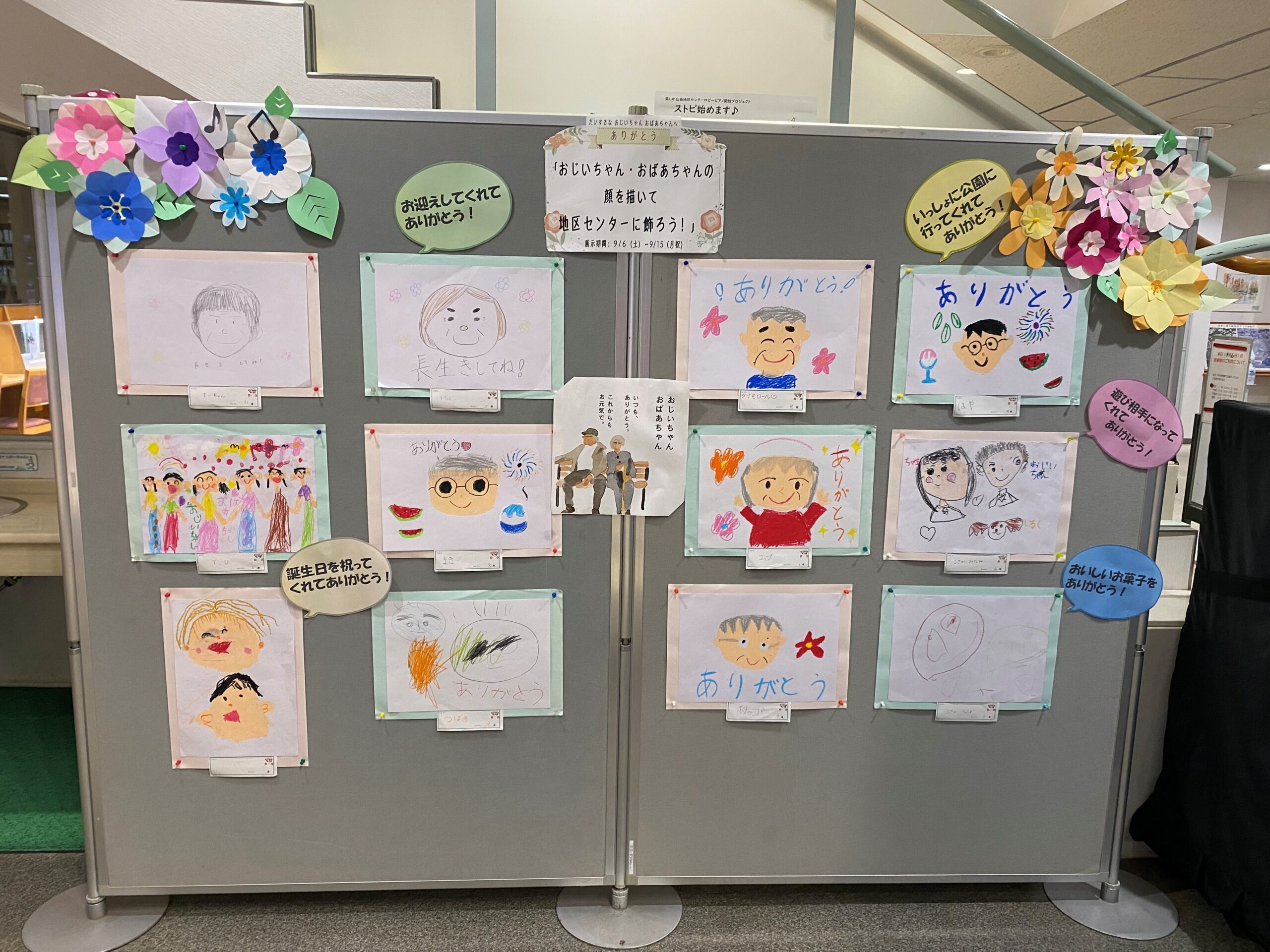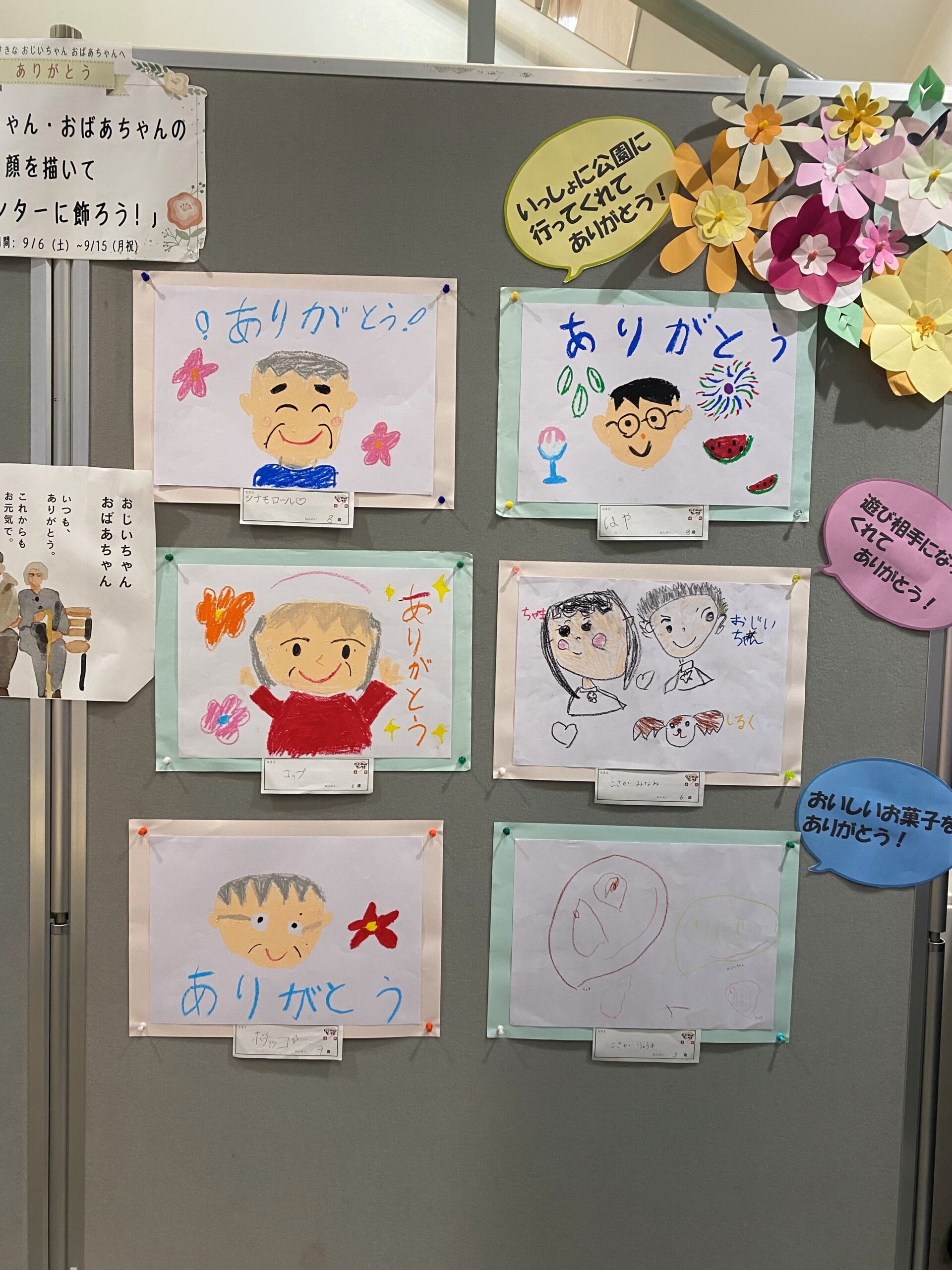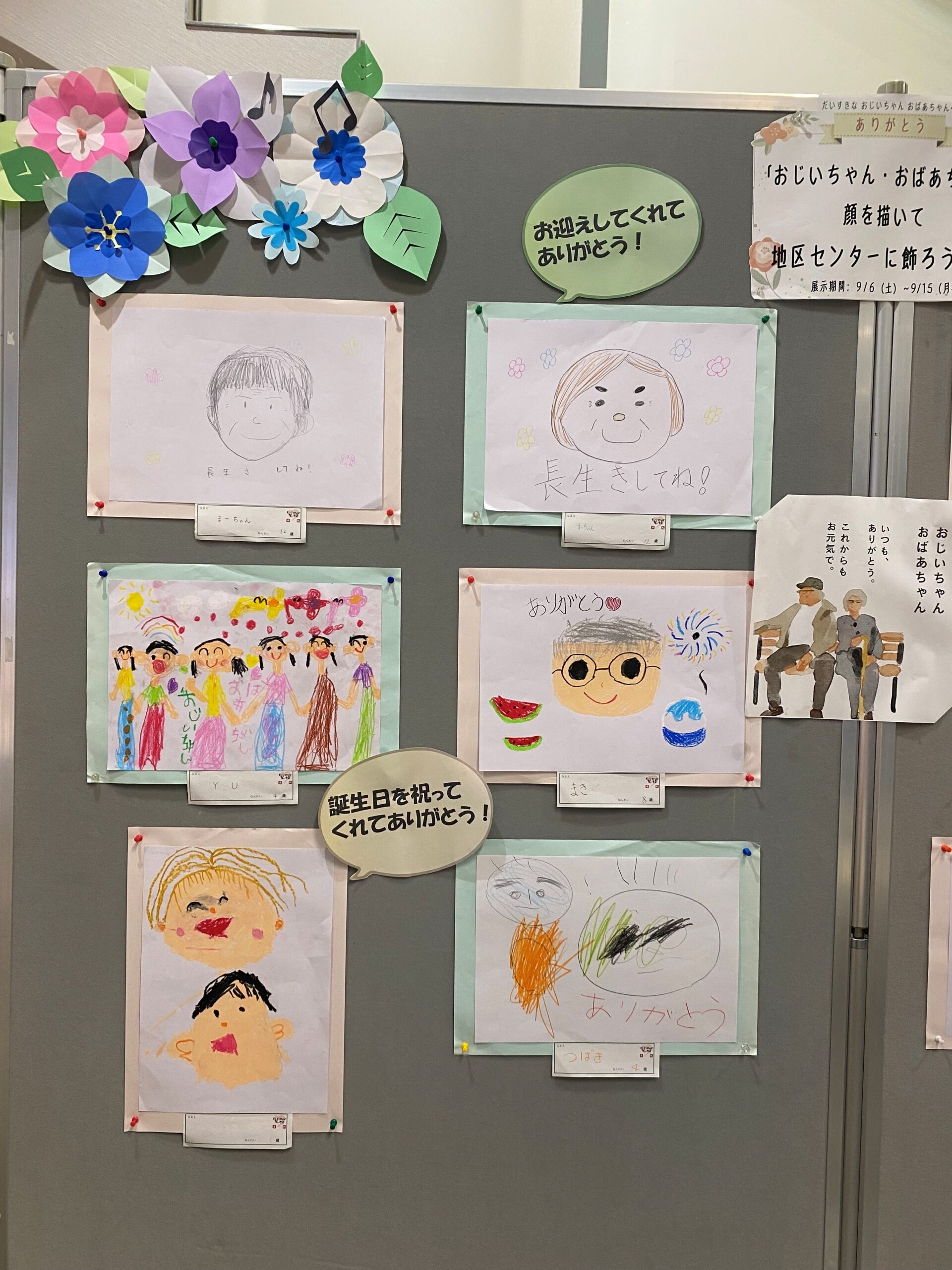 たくさんの子どもたちに”おじいちゃん・おばあちゃんのお顔”を描いていただきました。皆さん上手に描けていました。また今年は、大勢の子どもたちの絵によってパネルもとても賑やかに彩られました。