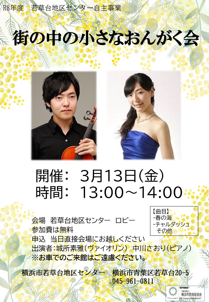 2026年02月02日 3月コンサート情報 0才からの「おはなしコンチェルト」 3月3日(火)11時30分~12時 音楽と絵本の読み聞かせ♪ 生の演奏と絵本の読み聞かせをお楽しみください。 出演:洗足学園音楽大学サークル 「おはなしコンチェルトたんぽぽの会」 詳細はこちら WEBのお申込みはこちら 街の中の小さなおんがく会 3月13日(火)13時~14時 城所素雅×中川さおりによるヴァイオリンとピアノの演奏会♪ 美しい音色に心を癒される時間をお届けします。 詳細はこちら